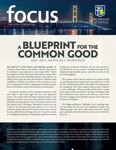 Catholics are called to a life of charity and justice, which includes engagement in the democratic process and in decisions that impact local communities. In this spirit, Michigan Catholic Conference exists as the advocacy voice of the Church in Michigan, standing up for justice and dignity during the formation of statewide public policy. Within its February FOCUS publication, A Blueprint for the Common Good, MCC outlines ten principles that will inform the organization's upcoming work at the State Capitol during the 2021-2022 legislative session: